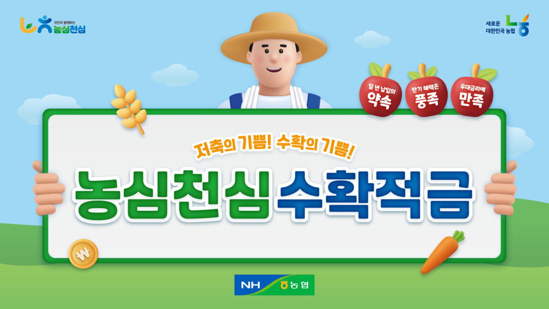'농심천심 수확적금'은 ‘저축의 기쁨과 수확의 기쁨을 동시에’라는 콘셉트로 만기 해지 시 고객별 우대금리와 함께 추첨을 통해 우리 지역 농산물을 제공하는 것이 특징이다. 인근 농축협 영업점에서 누구나 가입 가능하고, 매월 1만원 이상 100만원까지 납입 가능한 1년 만기 자유적립적금 상품이다.
