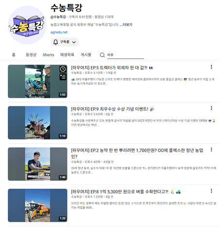 올해 6월 채널 개편 이후 ‘수농특강’은 유튜브, 페이스북, 인스타그램, 블로그, 카카오톡 등에서 총 67편의 영상을 제작했으며, 12월 1일 기준 전체 조회수 360만 회, 팔로워 6.8만 명을 달성하며 농업교육 분야 대표 홍보 채널로 자리매김했다.