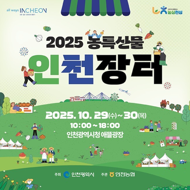 [농축환경신문] 인천광역시(시장 유정복)는 오는 10월 29일부터 30일까지 이틀간, 인천시청 애뜰광장에서‘2025 농특산물 인천장터’를 개최한다고 밝혔다.