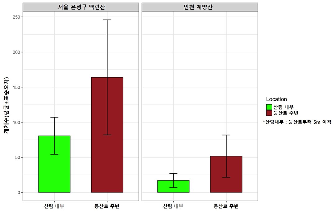 조사 결과, 러브버그 유충은 두 산 모두 등산로 주변과 능선 및 정상부에 상대적으로 많이 분포하는 것으로 확인했다. 현재 유통 중인 친환경 방제제를 사용해 러브버그 유충에 처리한 결과, 약 3주 경과 후 곤충 병원성 곰팡이류 방제제의 살충률은 약 90%, 식물 추출물 방제제의 살충률은 약 60% 이상이었다.