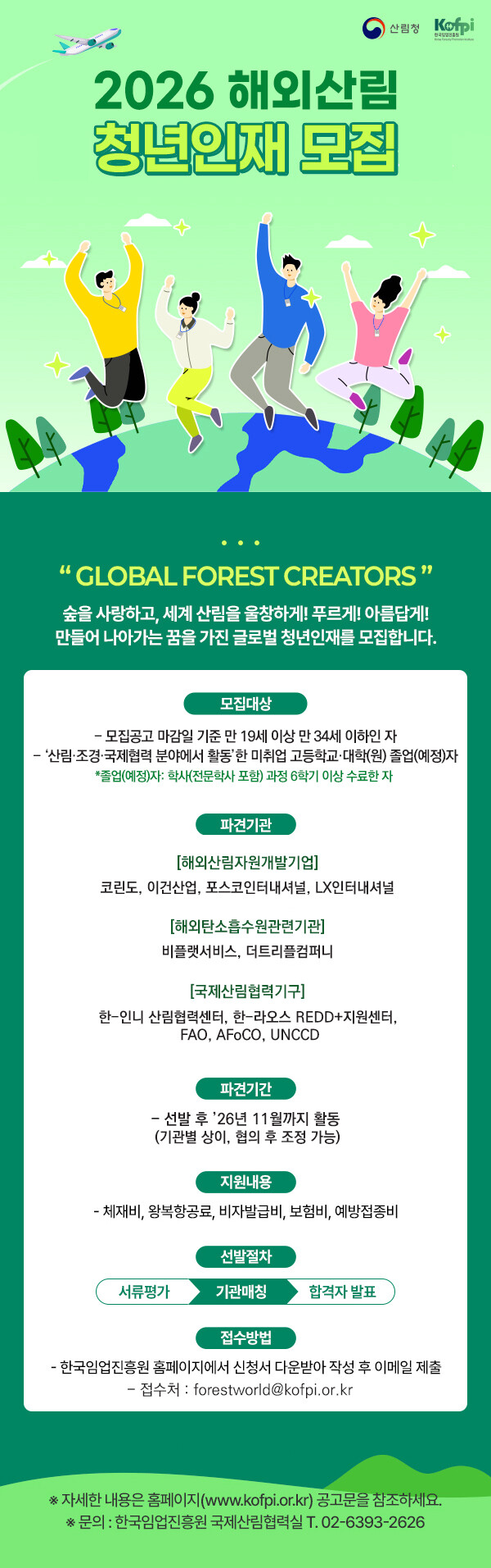 [농축환경신문] 산림청 산하 공공기관인 한국임업진흥원(원장 최무열)은 오는 3월 8일까지 ‘2026 해외산림청년인재 육성사업’ 참여자를 모집한다.