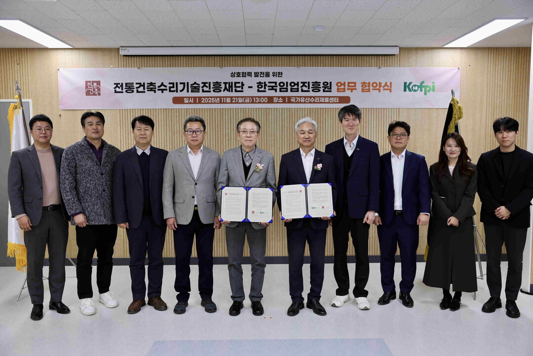 [농축환경신문] 산림청 산하 공공기관인 한국임업진흥원(원장 최무열)은 11월 21일(금), 국가유산수리재료센터에서 전통건축수리기술진흥재단(이사장 김창준)과 ‘국가유산의 복원·보존과 국산 목재·석재 이용 확대’를 위한 업무협약을 체결했다.