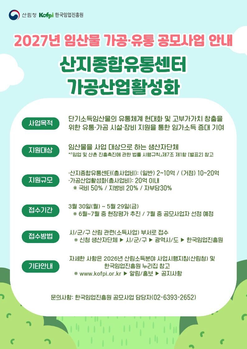 [농축환경신문] 산림청 산하 공공기관인 한국임업진흥원(원장 최무열)은 임산물의 수집・저장・가공 등 유통 체계의 현대화와 규모화를 지원하기 위해 3월 30일(월)부터 5월 29일(금)까지 ‘2027년 산림소득 유통・가공 분야’ 공모사업 참여 생산자 단체를 모집한다.