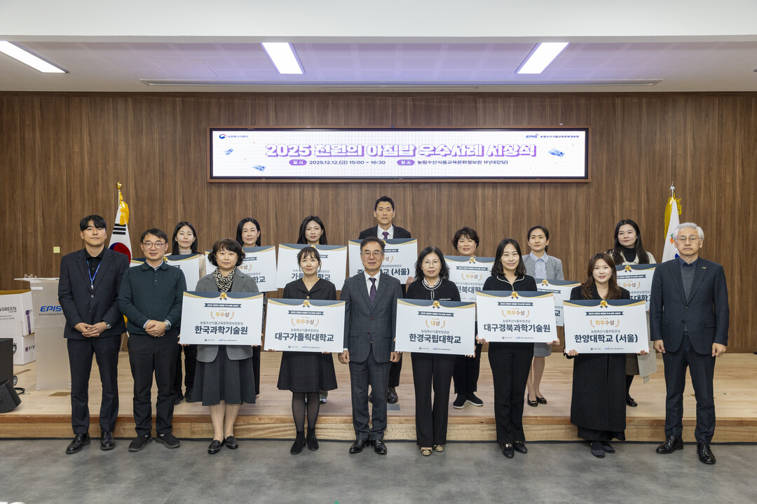 농림축산식품부와 농림수산식품교육문화정보원(농정원)은 12일 농정원 대강당에서 ‘2025 천원의 아침밥 성과공유회’를 개최하고 수상자들과 기념 사진을 찍고 있다.