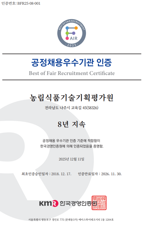 [농축환경신문] 농림식품기술기획평가원(원장 노수현·이하 농기평)은 한국경영인증원으로부터 8년 연속 ‘공정채용 우수기관 인증’을 획득했다고 11일 밝혔다.