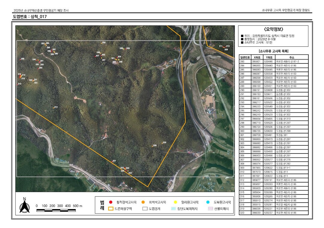 배포된 결과도면에는 ▲소나무류 고사목 위치 ▲고사 유형별 분포 현황 등이 포함되어 있으며, 지자체에서는 이를 토대로 전략적 예찰 및 방제계획을 수립할 수 있다. 현장 예찰방제단은 배포자료를 기준으로 인력 배치 및 작업 계획을 보다 효율적으로 운영할 수 있게 된다.