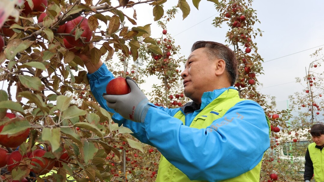 NH농협리츠운용은 지난 13일, 포천시 소재 사과농가를 방문하여 일손돕기를 실시했다. 임정수 대표이사가 사과 수확 작업을 하고 있다.