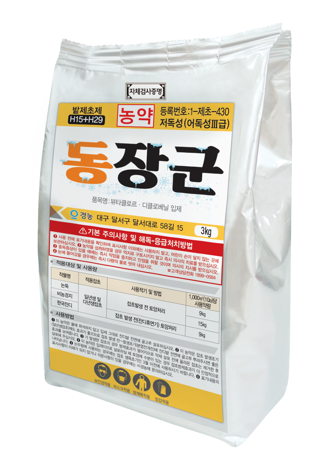 ‘동장군’은 입제 제형으로 사용이 간편하다. 비나 눈이 내린 후 자연스럽게 토양에 처리층이 형성되며, 이 처리층이 이듬해까지 잡초의 발아와 생육을 장기간 억제한다. 흡수이행형 제초제로서 발아 중인 잡초뿐 아니라 이미 발생한 잡초의 생육까지 억제하며, 잔디에는 영향을 주지 않아 약해 우려가 거의 없다. 또한 3kg 1봉으로 약 100평을 처리할 수 있어 경제성과 작업 효율성을 동시에 확보했다.