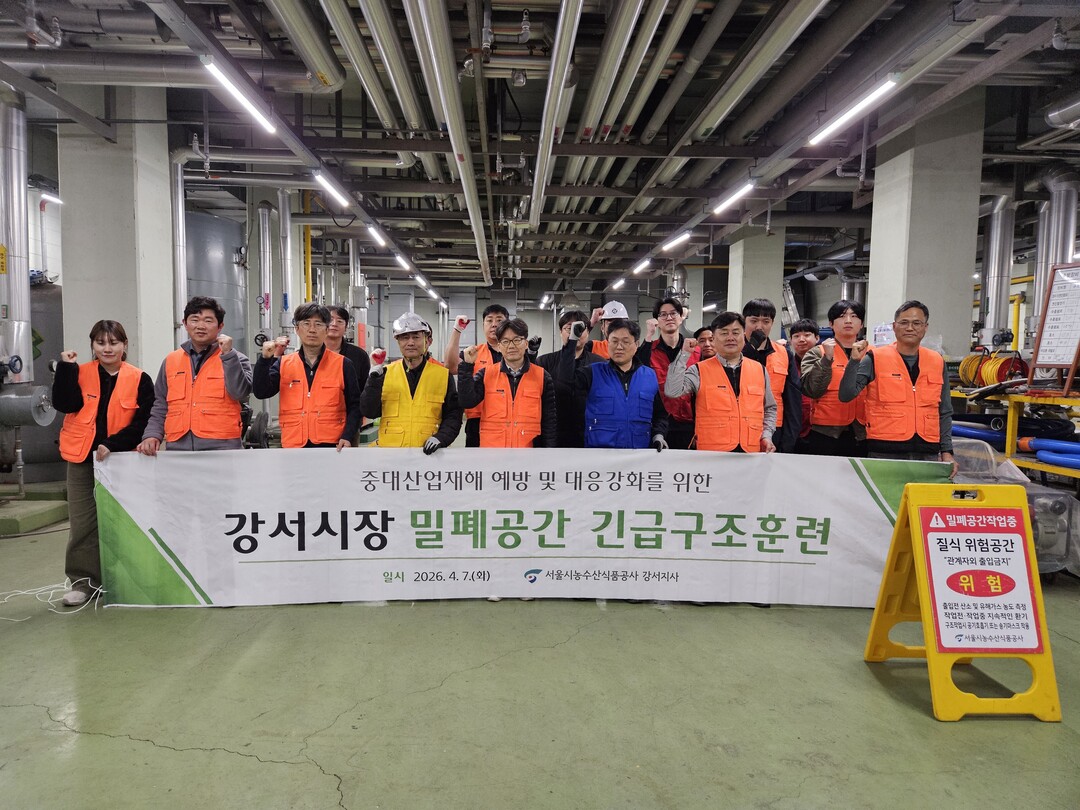 [농축환경신문] 서울시농수산식품공사 강서지사는 시장 내 밀폐공간 작업 중 발생할 수 있는 질식·화재·폭발 등 중대산업재해를 예방하고 피해 확산을 방지하기 위해 지난 4월 7일 밀폐공간 긴급구조훈련을 실시했다.