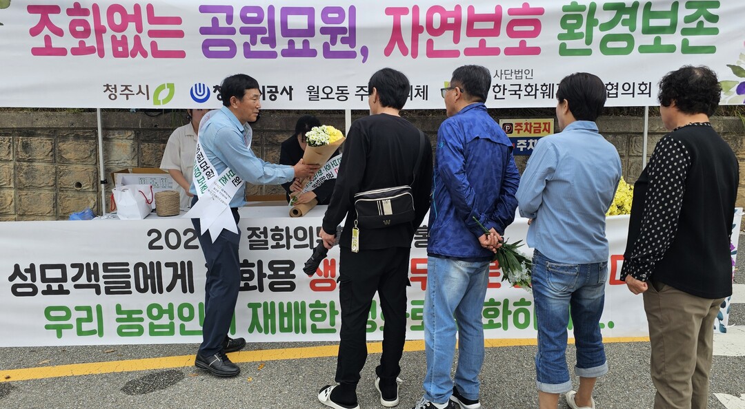 올해 추석에도 전국 공원묘원에서 ‘환경 오염 덩어리인 플라스틱 조화를 근절하고 우리 농업인이 재배한 생화로 헌화하세요’라는 캠페인이 진행됐다.