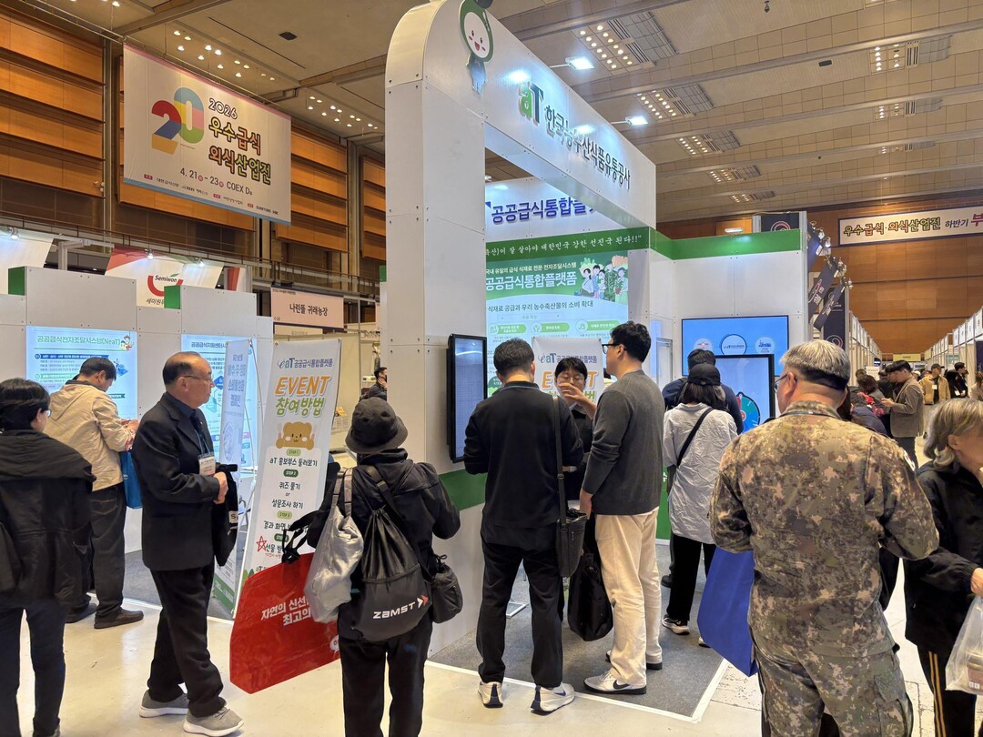 [농축환경신문] 한국농수산식품유통공사(aT, 사장 홍문표)는 21일부터 23일까지 서울 코엑스에서 열린 ‘2026 우수급식·외식산업전’에서 ‘공공급식통합플랫폼(eaT)’ 홍보부스를 운영했다고 밝혔다.