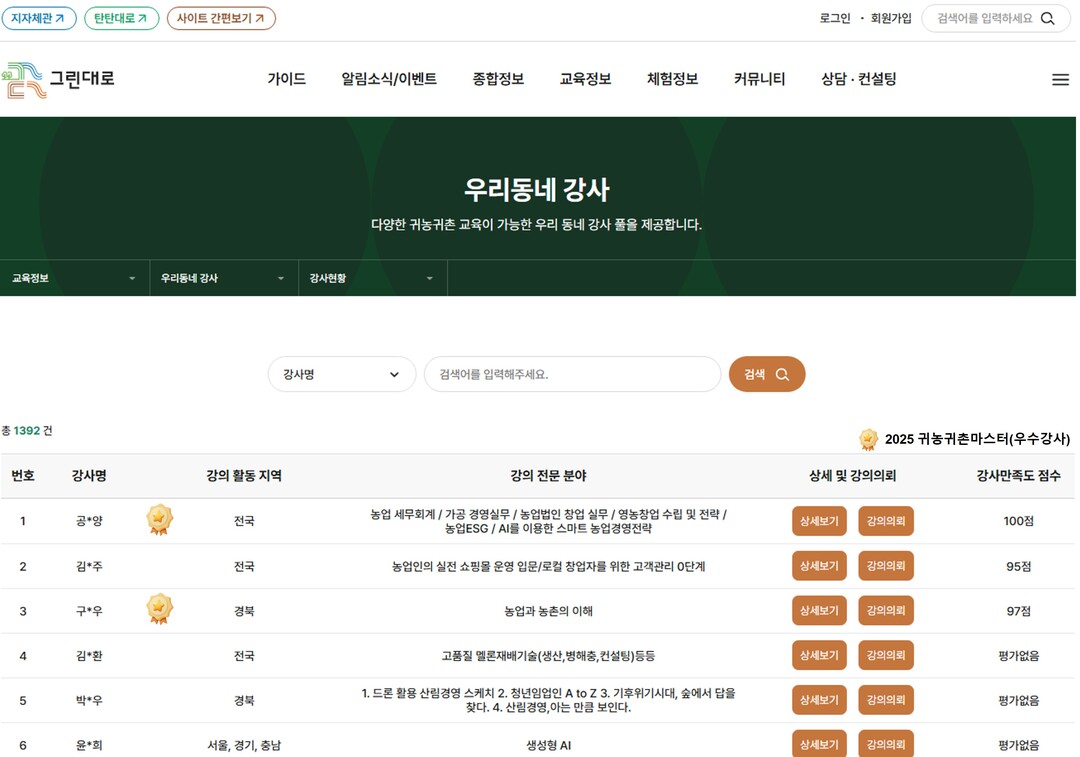 선정된 귀농귀촌마스터에게는 농정원장 명의의 인증서가 수여되며, 그린대로 홈페이지 ‘우리동네 강사’ 페이지에 우수강사 배지가 부착된다. 이를 통해 교육 수요자가 우수강사를 쉽게 확인하고 신뢰할 수 있는 강사를 선택할 수 있도록 지원할 예정이다.