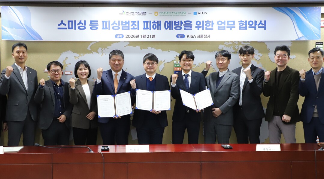 이번 협약은 ▲ 농협상호금융의 대고객 채널(NH콕뱅크) ▲ KISA의 악성 URL 등 피싱범죄 대응 정보 ▲ ATON의 AI 기반 실시간 탐지 기술 등을 결합한 「피싱·스미싱 방지 서비스」 도입(2월 중)을 앞두고, NH콕뱅크 고객의 자산 보호 및 선제적 전자금융 사고 예방 체계 구축을 위해 마련됐다.