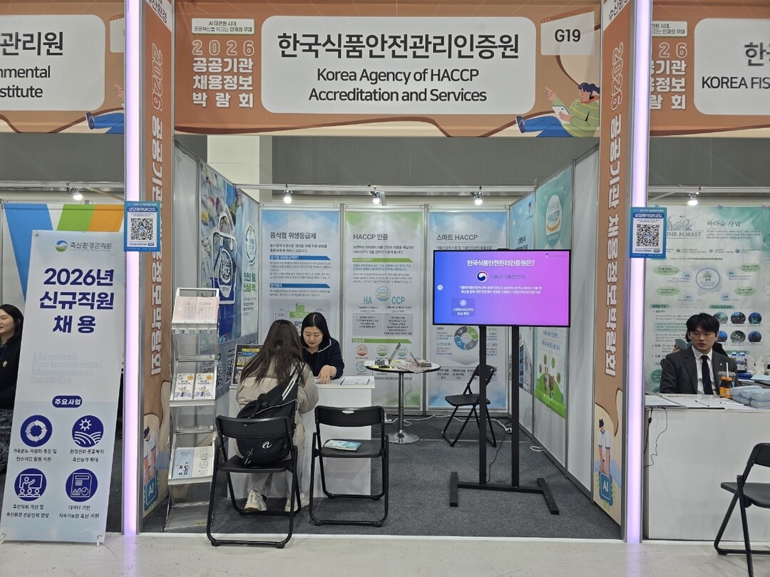 [농축환경신문] 한국식품안전관리인증원(원장 한상배, 해썹인증원)은 1월 27일(화)부터 29일(목)까지 에이티(aT)센터(서울 양재)에서 열린 ‘2026 공공기관 채용정보 박람회’에 참여해 채용 상담관(제2전시장)을 운영했다.