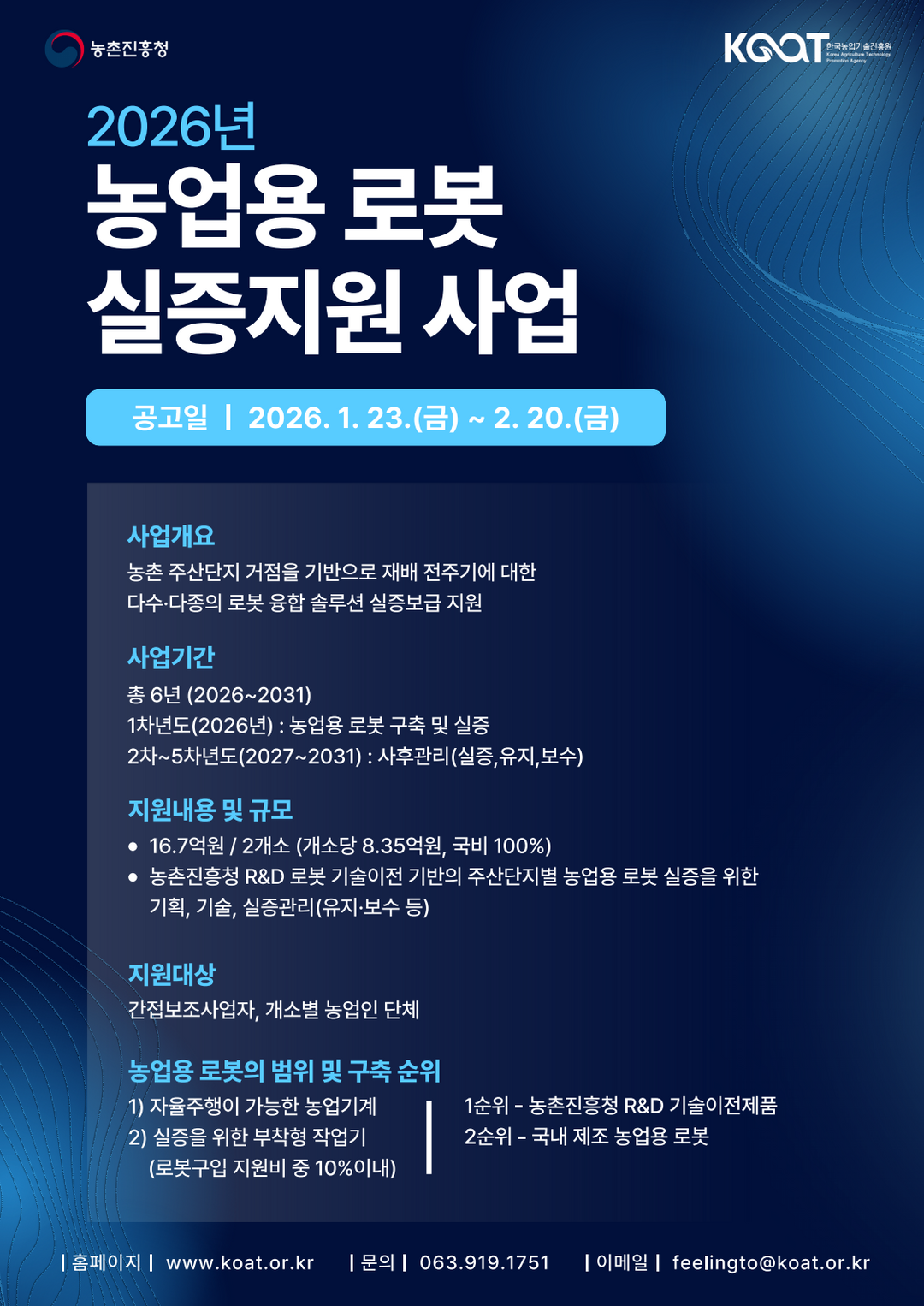 총 16억 7천만 원 규모의 예산으로 과수·식량·채소 분야 중 2개 사업자를 선정해 실증사업을 추진한다. 선정 기관은 로봇 구축부터 임대, 현장 적용, 사후관리까지 전 과정을 수행하게 된다.