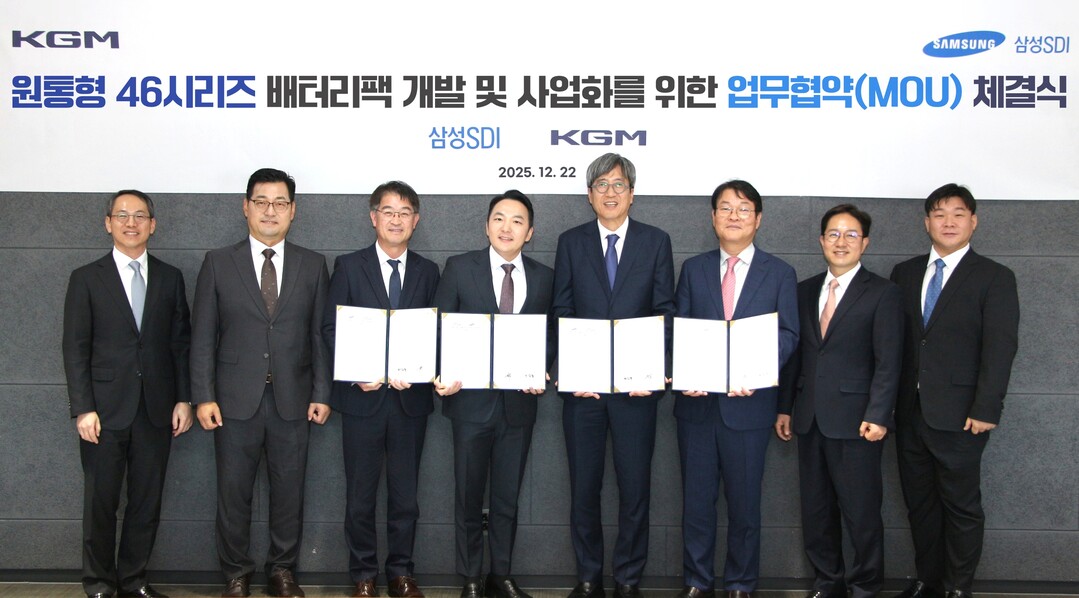 지난 22일 KG 타워(서울 중구 소재) 에서 열린 MOU 체결식에는 KGM 곽정현 사업전략부문장과 삼성SDI 최익규 소형사업부장을 비롯해 관계자들이 참석했다.