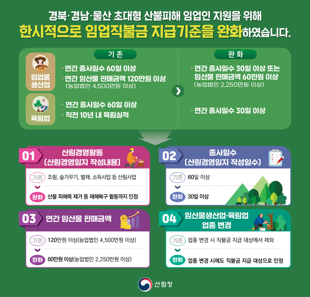 이상익 산림청 산림산업정책국장은 “산불로 생활 터전을 잃은 임업인들이 한시적 제도 완화를 통해 안정적으로 산림경영에 복귀할 수 있도록 적극적으로 지원할 계획이다.”고 밝혔다.