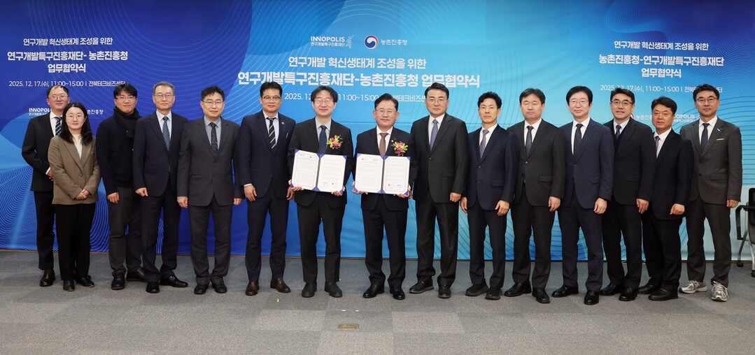 [농축환경신문] 농촌진흥청(청장 이승돈)은 17일 전북테크비즈센터에서 연구개발특구진흥재단(이사장 정희권)과 민관협력 기반의 선도형 연구개발(R&D) 생태계 구축을 위한 업무협약(MOU)을 체결했다. 이날 협약식에는 양 기관 주요 관계자들이 참석했다.