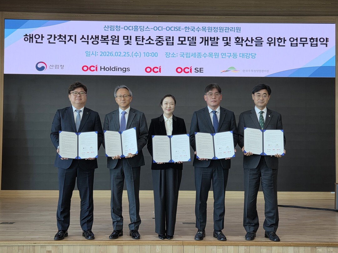 [농축환경신문] 산림청(청장 직무대행 박은식)은 한국수목원정원관리원, OCI홀딩스, OCI, OCISE와 함께 해안 간척지 식생복원 및 탄소중립 모델 개발·확산을 위한 업무협약을 국립세종수목원에서 체결했다.