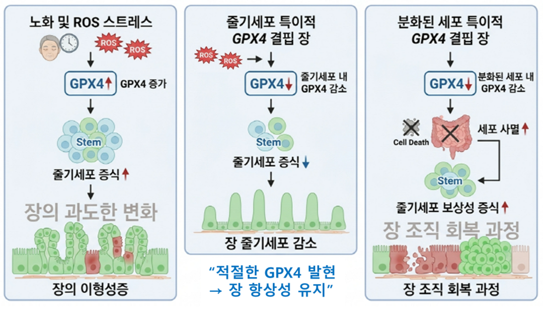 연구진은 먼저, 초파리 장에서 노화와 스트레스 조건 하의 Gpxl 발현 증가가 줄기세포 과다 증식과 관련이 있으며, 이는 장의 이형성증과 같은 표현형을 나타냄을 보여주었다(개념도, 왼쪽). 또한, 장 줄기세포에서 Gpxl 유전자를 제거하였을 때 스트레스 노출 시 장의 스트레스 방어 기전이 제대로 작동하지 않는 것을 확인하였다(개념도, 중간). 이와 반대로, 분화된 세포 특이적으로 Gpxl 유전자를 제거하였을 때 분화된 세포의 세포 사멸 증가 및 줄기세포의 과다 증식으로 인해 장의 정상적 구조가 무너질 뿐만 아니라, 외부 스트레스에 노출 없이도 장 손상이 발생하는 것을 관찰하였다(개념도, 오른쪽). 이를 통해 장내 세포별 Gpxl의 발현 조절은, 노화나 스트레스 노출 시 세포 손상 신호 및 영양 신호 기전을 통해 조절하여 장 환경을 유지하는데 중요한 핵심 역할을 한다는 것을 밝혀냈다. 이 연구 결과는 국제 학술지 Free Radical Biology and Medicine(Volume 241, 2025, IF 8.2)에 게재되었다. 이번 연구에서 노화된 마우스의 장에서도 동일하게 확인되어, Gpxl의 항산화 기전이 사람에게도 적용될 가능성을 시사한다.
