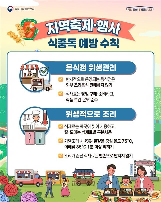 식약처는 앞으로도 식중독 걱정 없이 지역축제‧행사를 즐길 수 있도록 관계기관과 긴밀히 협력해 위생관리를 강화하고 신속검사차량 운영 등 다양한 식중독 예방 활동을 추진하여 국민의 안전한 일상을 지원할 계획이다.