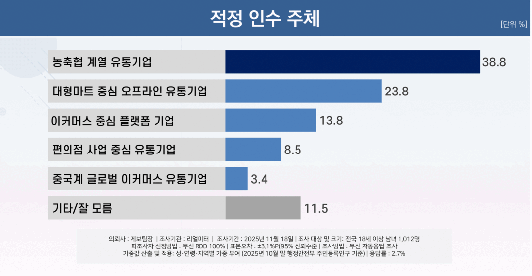 국민 과반이 국내 유통산업 경쟁력이 낮다고 느끼는 가운데, 회생 절차 중인 홈플러스를 인수하기에 가장 적합한 기업으로 '농협 계열 유통기업'을 꼽은 것으로 나타나면서 농협 인수론에 힘이 실리고 있다.