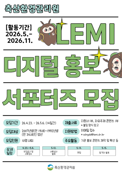 [농축환경신문] 축산환경관리원(원장 문홍길)은 청년의 시각에서 축산환경 정책을 국민에게 더 쉽고 재미있게 전달하기 위해 ‘2026 LEMI 디지털홍보 서포터즈’를 4월 23일부터 5월 6일까지 모집한다고 27일 밝혔다.