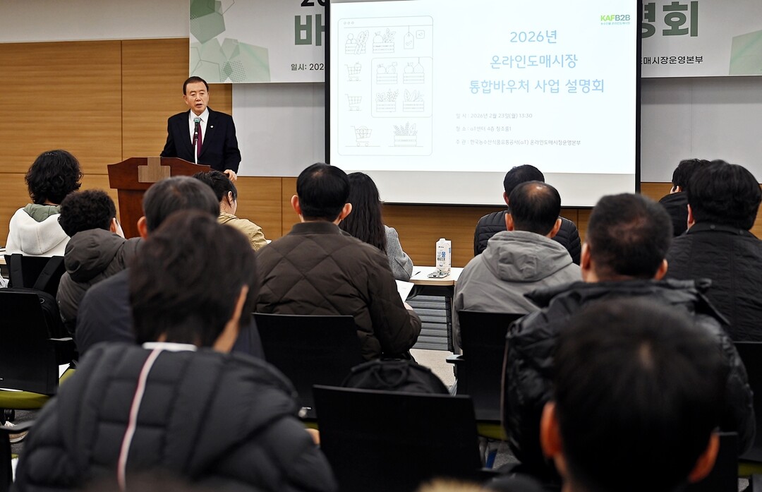 [농축환경신문] 한국농수산식품유통공사(aT) 홍문표 사장은 23일 서울 aT센터 에서 열린 ‘2026년 온라인도매시장 바우처지원사업 설명회’에 참석해 판·구매사 약 160명을 대상으로 인사말씀을 전했다.
