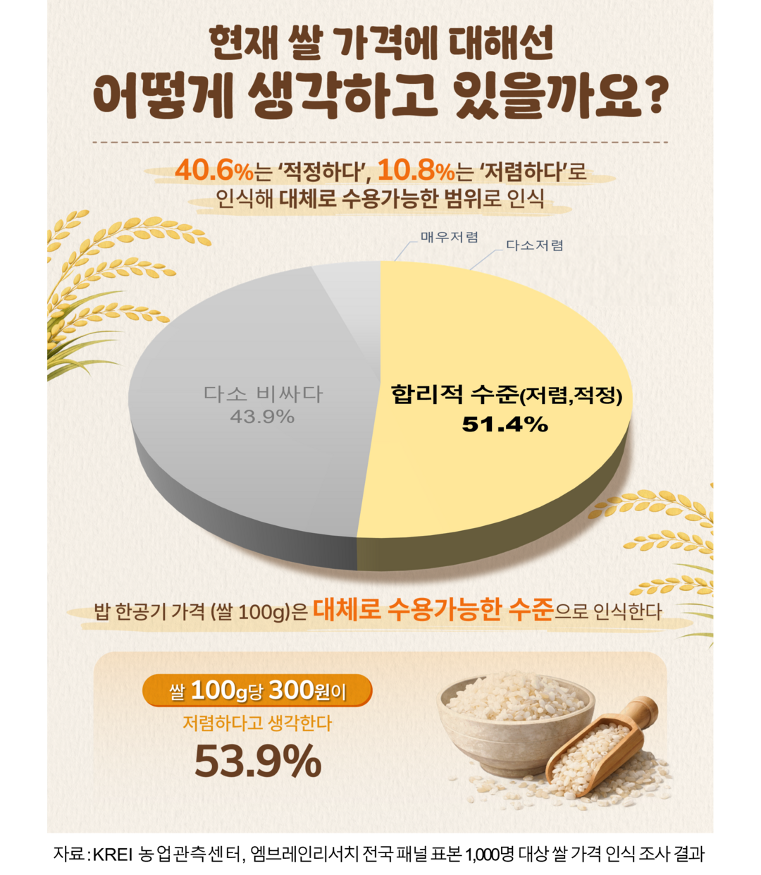 지난해 11월 한국농촌경제연구원(KREI) ‘쌀 소비자 인식조사’ 결과에 따르면 응답자의 40.6%가 현재 쌀값에 대해 ‘적정하다’고 답했으며, ‘저렴하다’는 응답도 10.8%에 달했다.