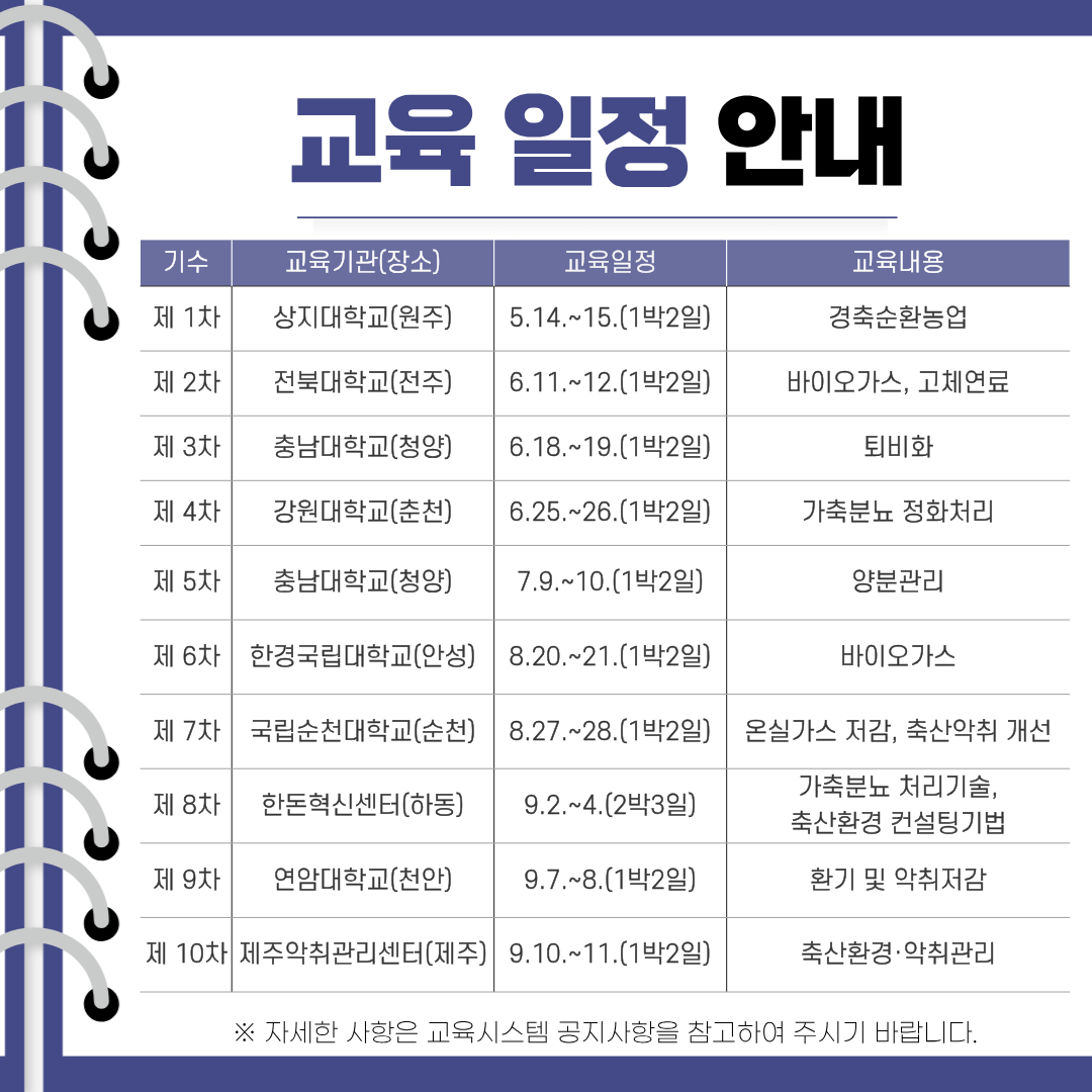 교육분야는 ▲가축분뇨 처리 및 다각화(퇴·액비화, 정화, 바이오가스화, 고체연료), ▲축산악취 개선 및 환기, ▲경축순환농업 및 양분관리, ▲온실가스 감축 등으로 정책 현안과 현장의 수요를 적극 반영하였다.