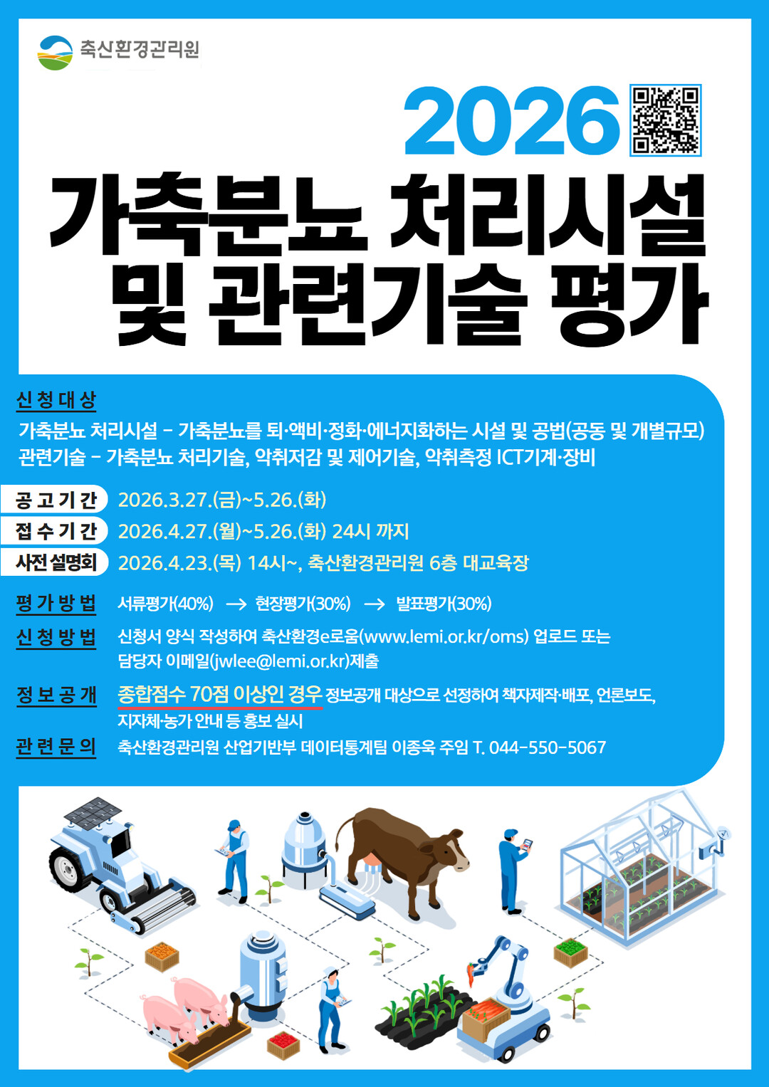 [농축환경신문] 축산환경관리원(원장 문홍길)은 3월 27일부터 5월 26일까지 ‘2026년 가축분뇨 처리시설 및 관련기술 평가 계획’을 공고하고, 신청 접수는 4월 27일부터 진행한다고 밝혔다.