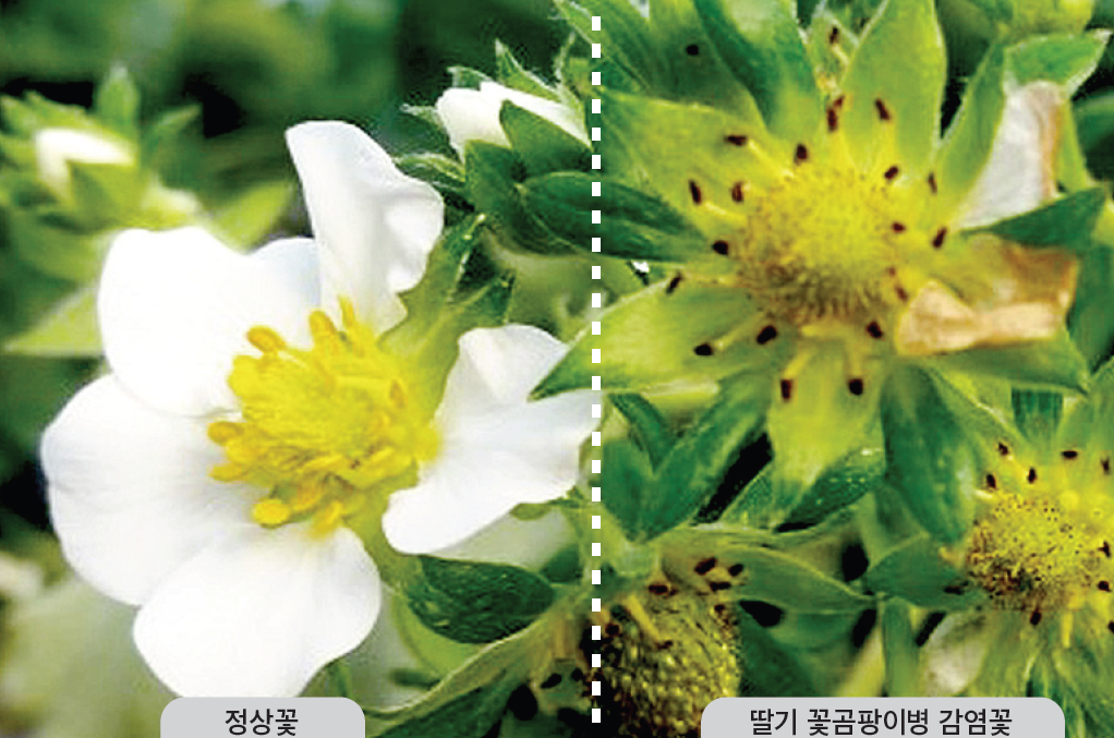 딸기 꽃곰팡이병은 주로 1월부터 4월 사이에 발생한다. 평균 발병률은 약 20% 수준이고, 2화방에서 피해가 집중적으로 나타나는 것이 특징이다. 병원균이 꽃의 암술머리에 감염될 경우 정상적인 수분이 이뤄지지 않아 과실 비대가 저해될 뿐만 아니라 기형과 발생으로 이어질 수 있다. 암술머리를 중심으로 회색 곰팡이가 발생하며, 심화되면 꽃받침까지 흑변하고 마르는 증상이 나타난다.