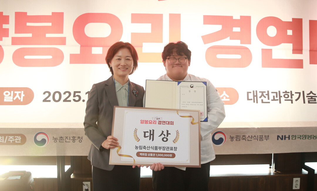 대상(농림축산식품부장관)에는 양봉산물 밤꿀을 이용해 ‘가을 한입 밤꿀 몽블랑 수플레’를 만든 ‘김결이’ 참가자가 선정됐다. 묵직한 풍미와 단맛을 내는 밤꿀과 잼을 이용해 만든 크림을 수플레 위에 올린 후식(디저트)이다. 심사위원들은 주제에 맞게 간편하면서도 맛과 영양이 조화를 이룬다며 높이 평가했다.