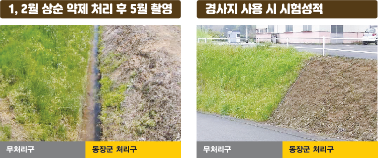 ‘동장군 입제’의 가장 큰 강점은 약효의 지속성이다. 겨울철 한 번만 처리해도 봄까지 잡초 발생을 효과적으로 억제할 수 있다. 특히 잔디 휴면기인 11월부터 2월 사이에 살포하면 토끼풀, 제비꽃, 쑥, 민들레 등 월동 잡초의 생육을 차단해 이듬해 봄 예초 작업 횟수를 줄여 노동력이 크게 절감된다. 잡초의 뿌리 지지층이 유지돼 방제가 까다로운 경사지나 제방, 논둑 등에 처리하더라도 토양 붕괴 위험이 적다는 점도 장점이다.