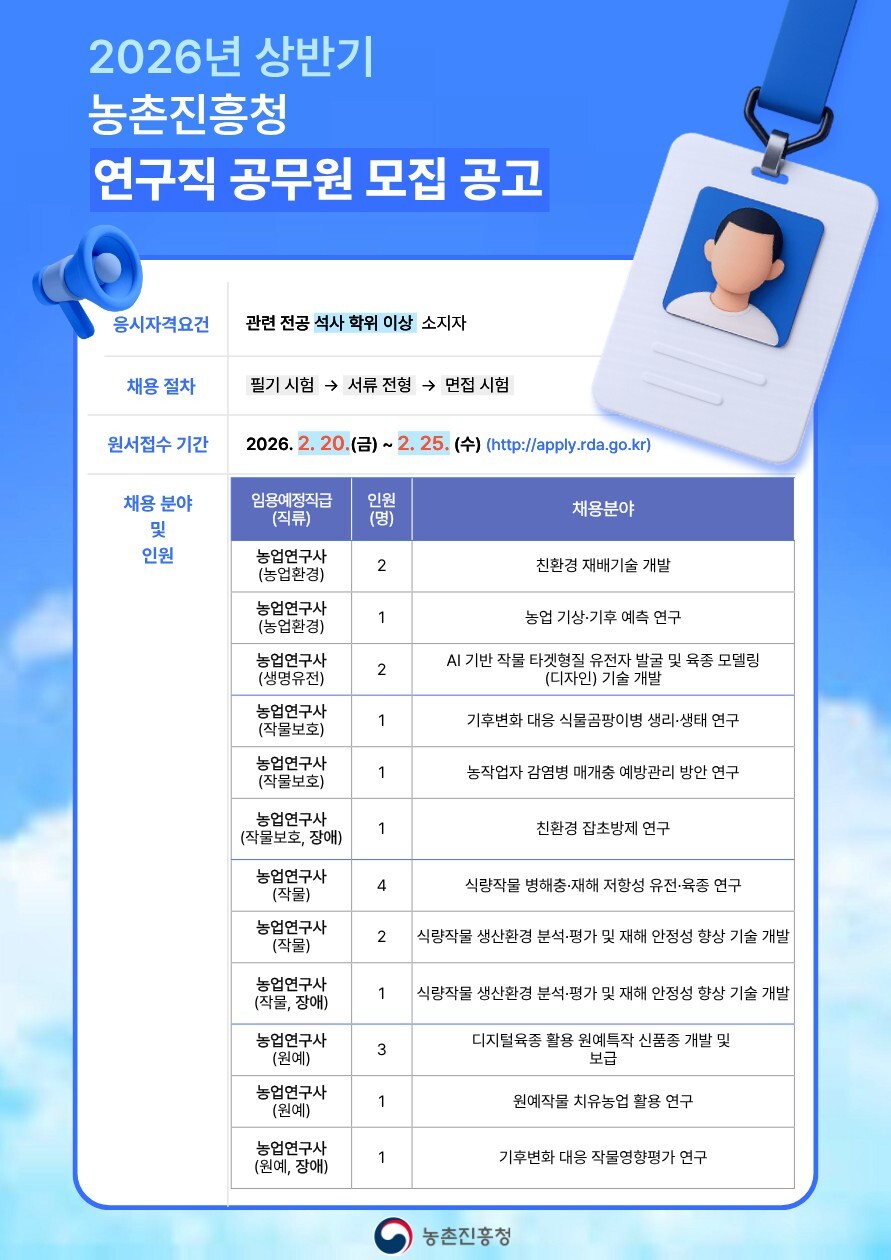 [농축환경신문] 농촌진흥청(청장 이승돈)은 2026년도 연구직 공무원 20명을 경력경쟁채용시험을 통해 선발한다고 밝혔다.