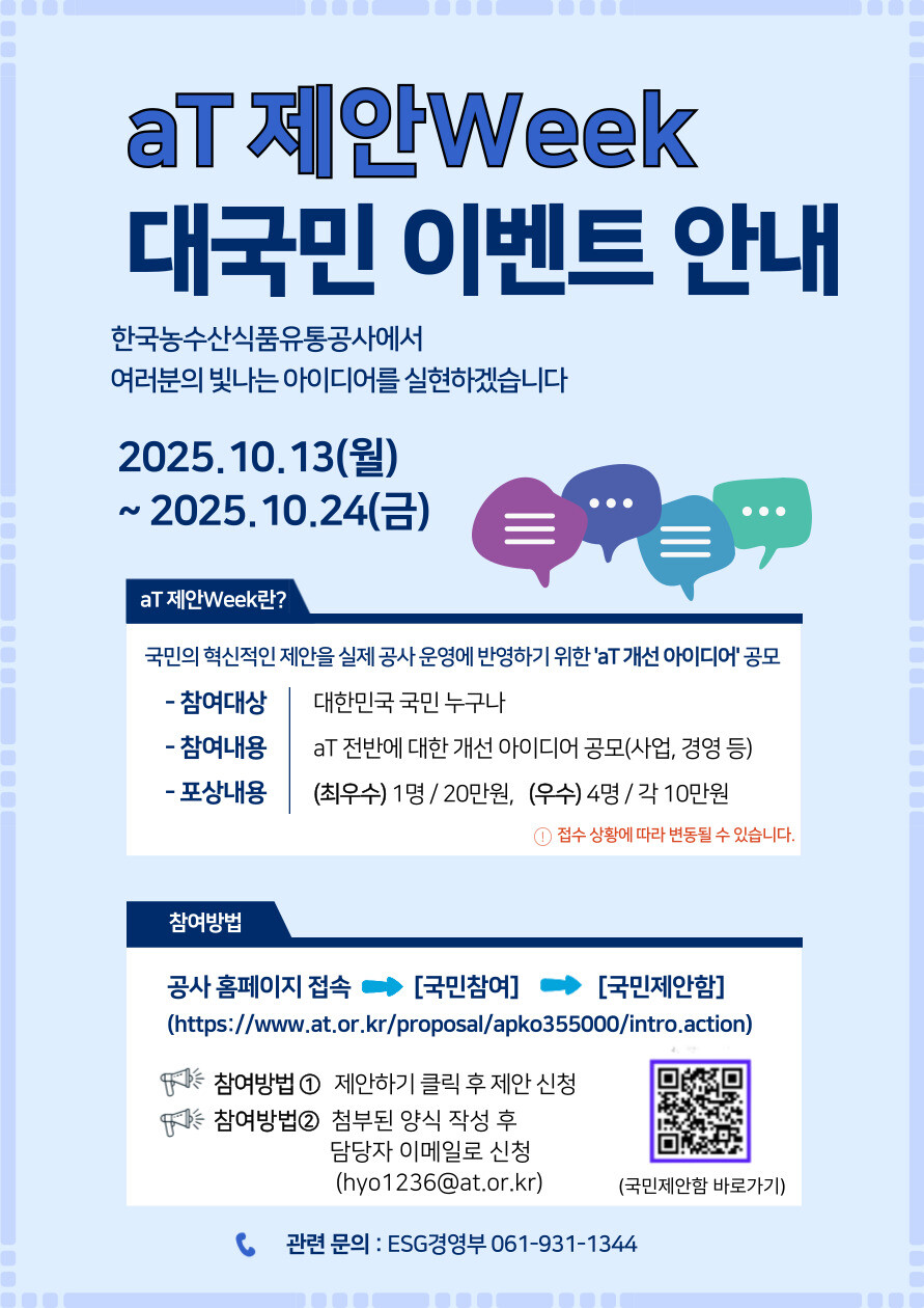 [농축환경신문] 한국농수산식품유통공사(사장 홍문표)는 사업과 경영 개선을 위한 국민 아이디어를 발굴하기 위해 24일까지 ‘aT 제안 Week(집중제안주간)’를 진행한다.