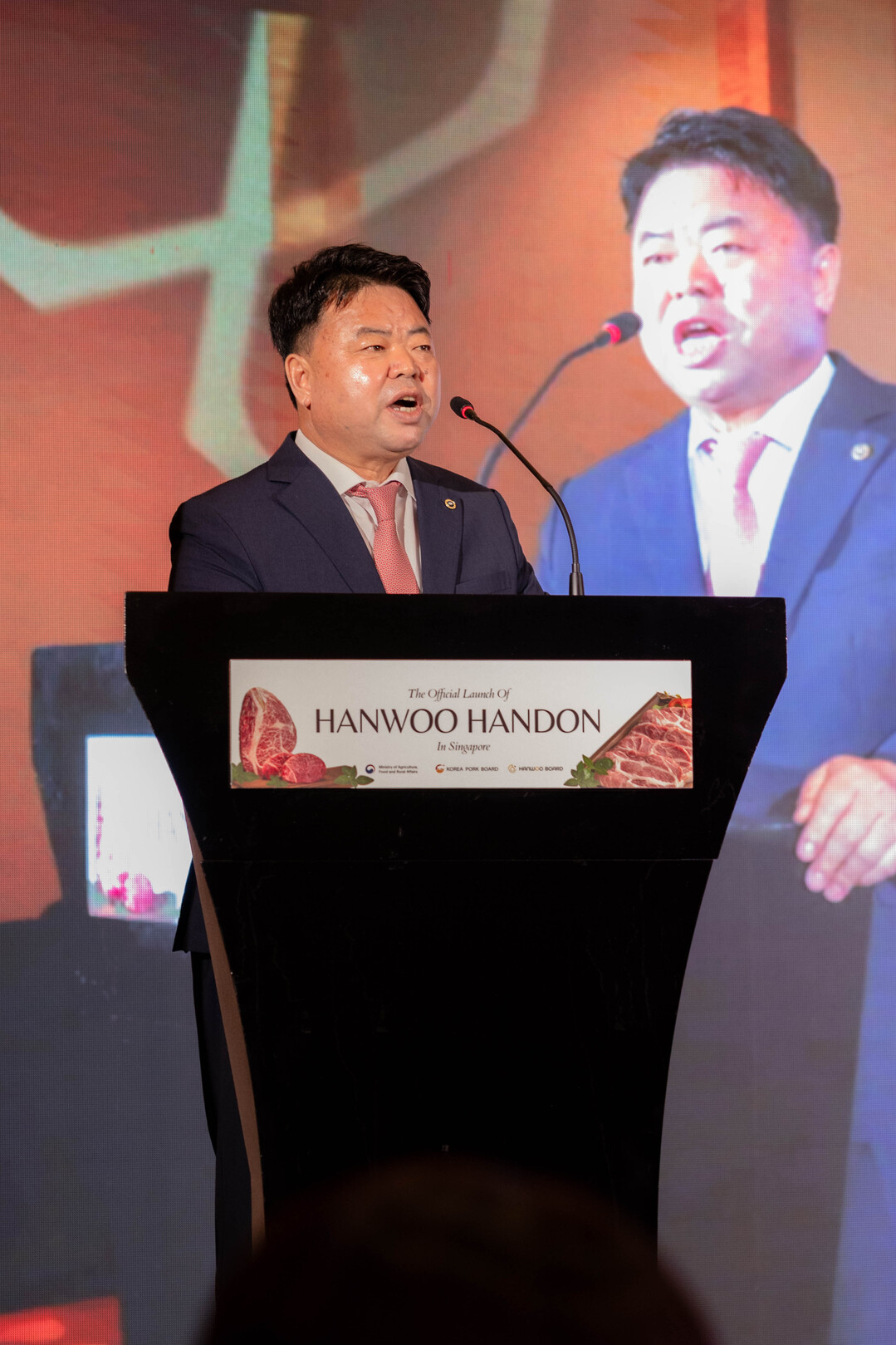 이기홍 한돈자조금관리위원회 위원장이 싱가포르 현지 무대에 올라 축사를 통해 한돈의 글로벌 경쟁력과 수출 비전을 강조하고 있다.