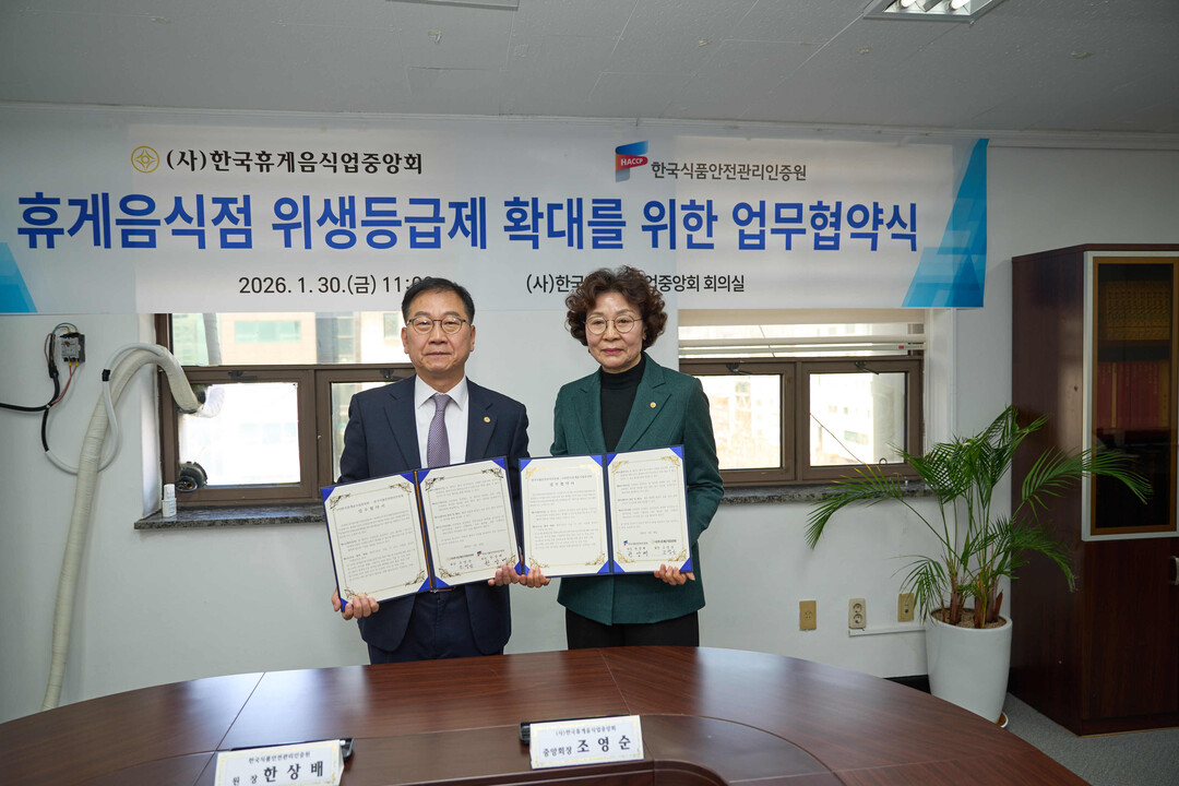 [농축환경신문] 한국식품안전관리인증원(원장 한상배, 해썹인증원)과 사단법인 한국휴게음식업중앙회(회장 조영순)는 30일에 휴게음식점의 위생관리 수준을 높이고 식품안심업소(위생등급 지정업소) 확대를 위한 업무협약(MOU)을 체결했다.