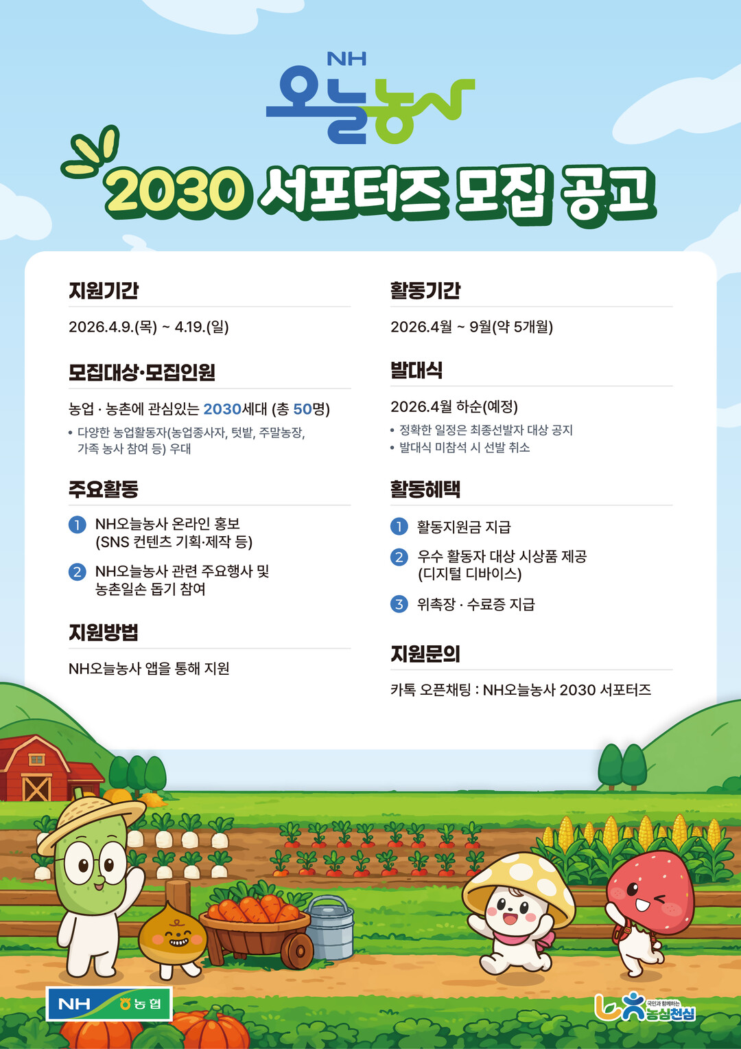 최한호 디지털전략부장은 “이번 'NH오늘농사 2030 서포터즈'는 청년 세대와 함께 농업의 가치를 공유하고 디지털 농업 확산을 이끄는 계기가 될 것”이라며 “열정과 창의성을 갖춘 청년들의 많은 참여를 기대한다”고 밝혔다.