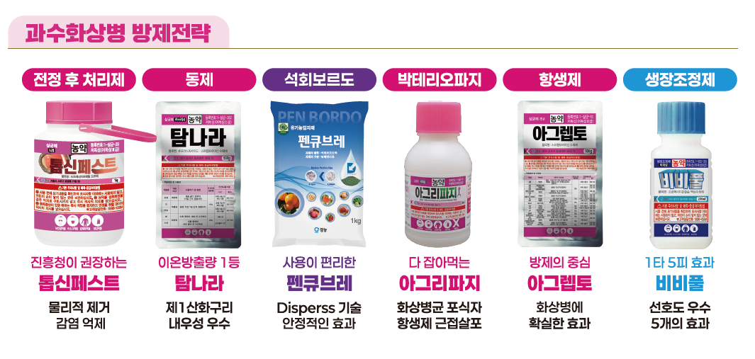 만개 5일 후에는 ‘아그렙토’를 중심으로 효과가 확실한 항생제를 처방해 감염 확산을 막아야 한다. 만개 15일 후에는 작물 세력‧수세를 안정시키는 ‘비비풀(액상)’을 처리해 조직의 강도를 높이고 감염 리스크를 줄여야 한다.