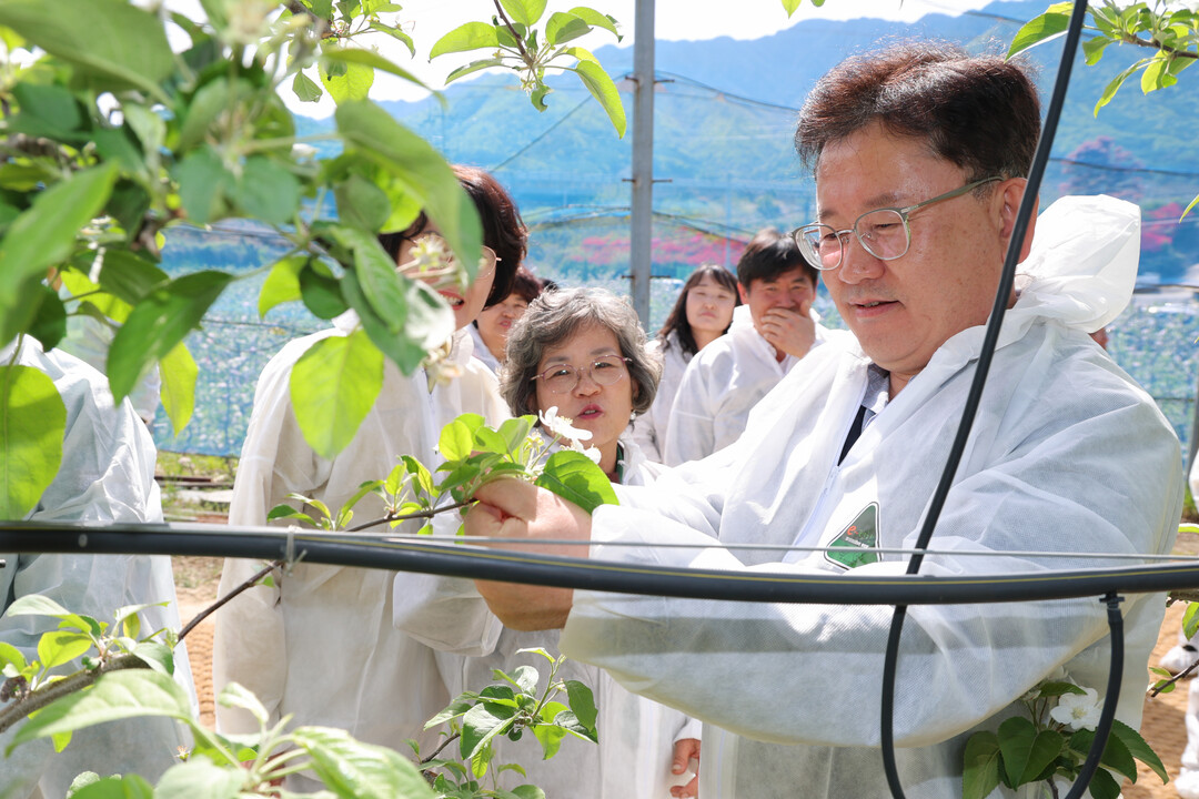 [농축환경신문] 이승돈 농촌진흥청장은 22일, 경북 영주시 풍기읍 사과 과수원을 찾아 과수화상병 예방을 위한 개화기 약제 방제 상황을 살피고, 영주시농업기술센터의 과수화상병 예찰·방제 계획을 들은 후 현장 관계자들을 격려했다.