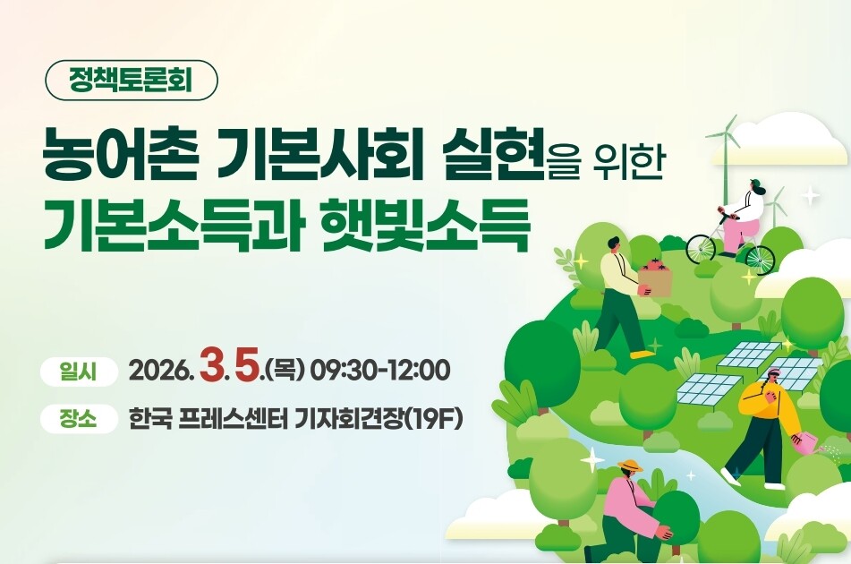 [농축환경신문] 한국농촌경제연구원(원장 한두봉)은 경제·인문사회연구회 농촌기본사회연구단, 한국에너지공단과 공동으로 3월 5일 오전 9시 30분 한국프레스센터 기자회견장에서 ‘농어촌 기본사회 실현을 위한 기본소득과 햇빛소득’ 정책토론회를 개최한다.
