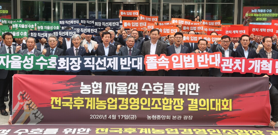 [농축환경신문] 전국후계농업경영인조합장협의회(회장 박정수, 이하 협의회)가 17일 서울 중구 농협중앙회 본관 광장에서 '농협 자율성 보장촉구' 결의대회를 개최했다.