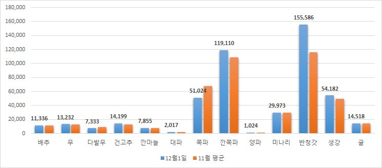 주요 김장 재료인 배추와 무는 출하량이 늘었음에도 가격은 보합세를 유지했다. 10월 잦은 폭우로 생육이 지연되며 상품성 차이로 가격 편차가 크게 발생한 영향이다. 12월 1일 기준 배추(상품)의 평균가는 11,330원, 무는 13,230원으로 전월 대비 큰 변동이 없었다. 반면 대파·쪽파 등 채소류는 수도권 김장 성수기 진입으로 수요 증가에 따라 소폭 상승했고, 고춧가루·새우젓·멸치액젓·천일염 등 부재료는 보합세를 보였다.