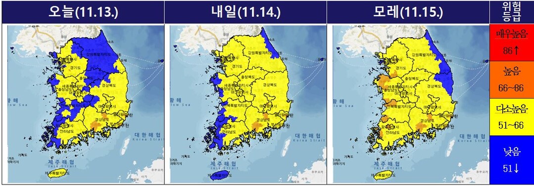 국가산불위험예보시스템 산불위험지수를 분석한 결과, 최근 5년간 11월에 산불위험지수가 ‘다소 높음’ 단계일 때 하루 평균 1.2건의 산불이 발생했다. ‘높음’ 단계에서는 ‘다소높음’ 단계보다 2.5배 많은 하루 평균 3건의 산불이 발생한 것으로 분석되었다.