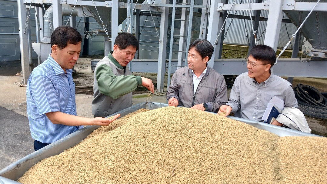 [농축환경신문] 15일 전북 김제시 신풍동의 벼 재배 농가를 방문한 농촌진흥청 국립식량과학원 곽도연 원장이 농업인으로부터 벼 생육 현황을 듣고 수확 현장을 점검하고 있다.(농촌진흥청 제공)