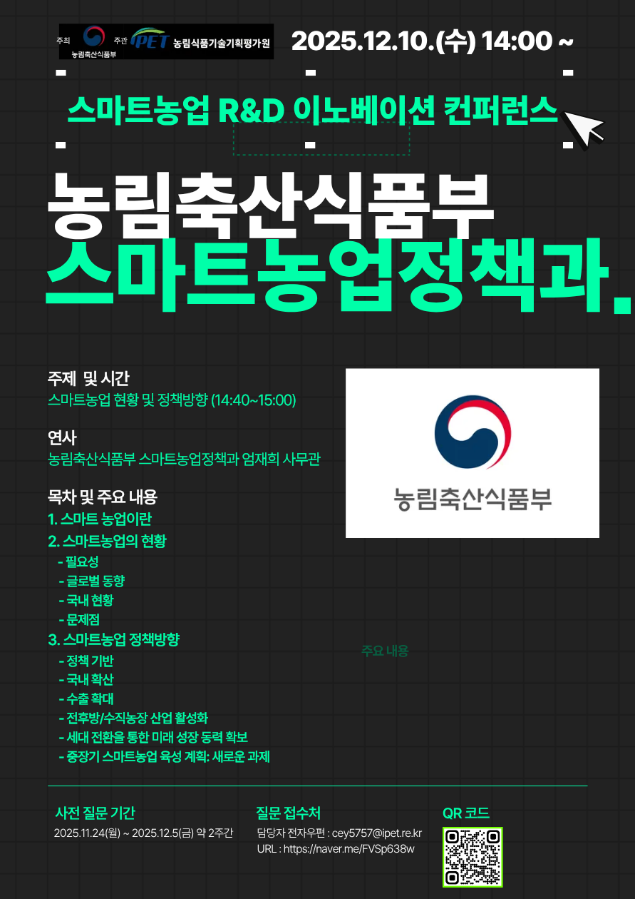 농기평은 행사 전 발표 자료, 연사 정보, 사전 질문 링크, 카드뉴스 등을 제공해 연구자 참여를 확대할 예정이며, 이번 컨퍼런스를 통해 연구자와 산업·현장 전문가 간 협력이 강화될 것으로 기대하고 있다.