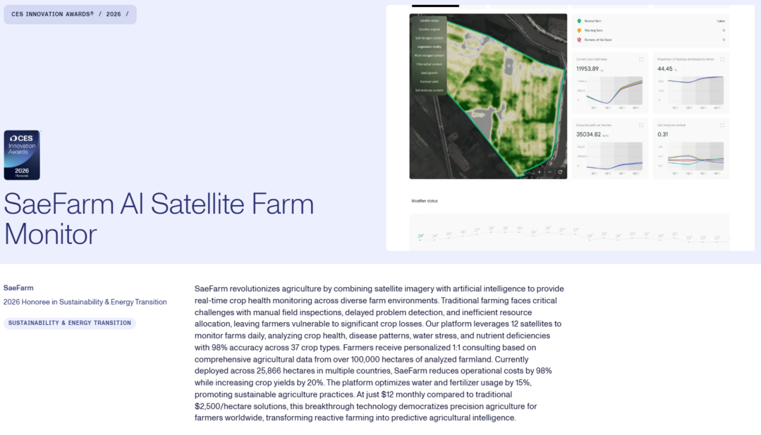 이번 수상은 국내 농식품 기술 스타트업이 AI·위성 기반 스마트농업 분야에서 글로벌 경쟁력을 인정받은 첫 사례로 의미가 크다.