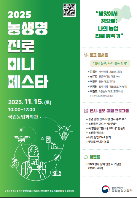 [농축환경신문] 농촌진흥청(청장 이승돈)은 청소년들에게 농업의 가치와 다양성 체험 기회를 제공하고, 진로 탐색의 장을 마련하기 위해 11월 15일 농업과학관에서‘2025년 농생명 진로 미니 페스타’를 개최한다.